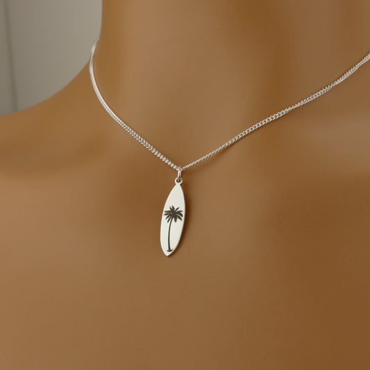 Sterling Silver Surfboard Necklace – Palm Tree Pendant in Silver, Gold & Rose Gold by Apsley and Heron